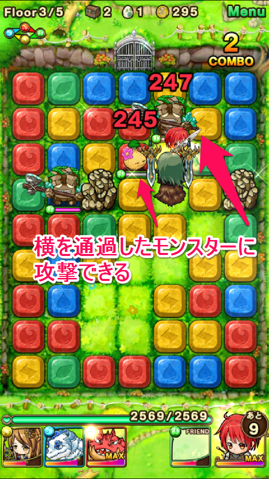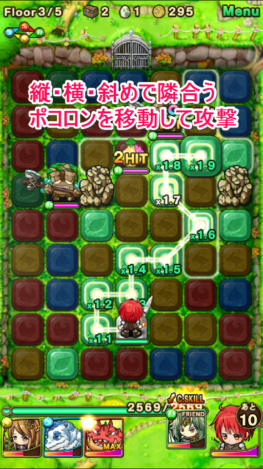 プレイヤーは消したポコロン上を移動し、横を通過したモンスターにしか攻撃できません。さらに消したポコロンの数によって攻撃力が変化するといった、パズルRPGの醍醐味も健在です。