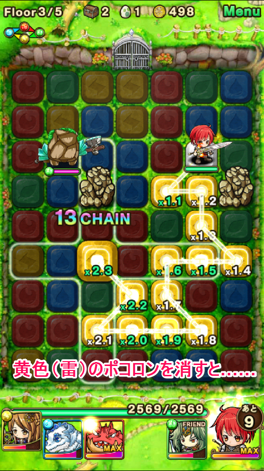 他にも消した色の属性を持つキャラが攻撃に参加するなど、移動+属性といった2つの要素を同時に考えながらプレイするのは正に至難の業。